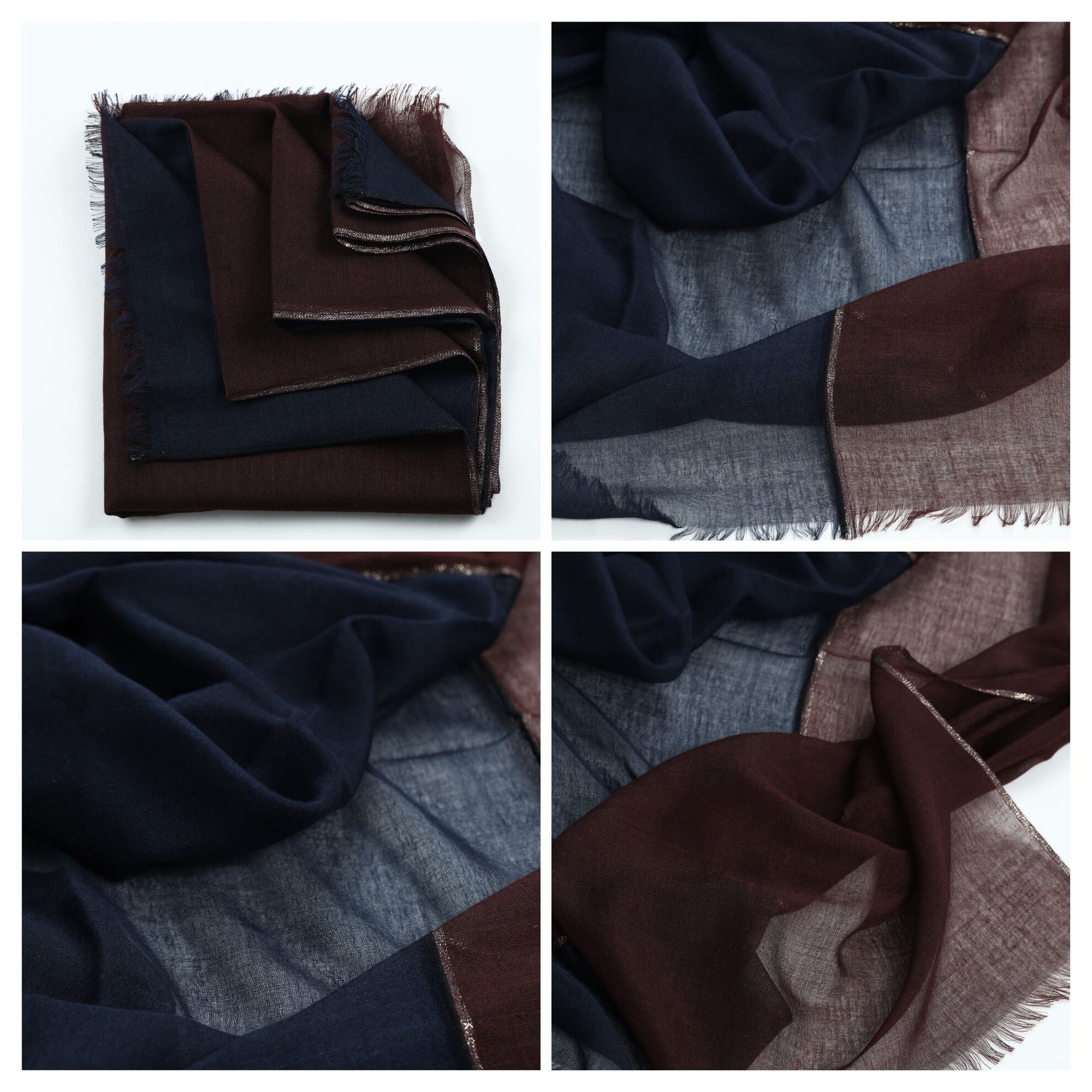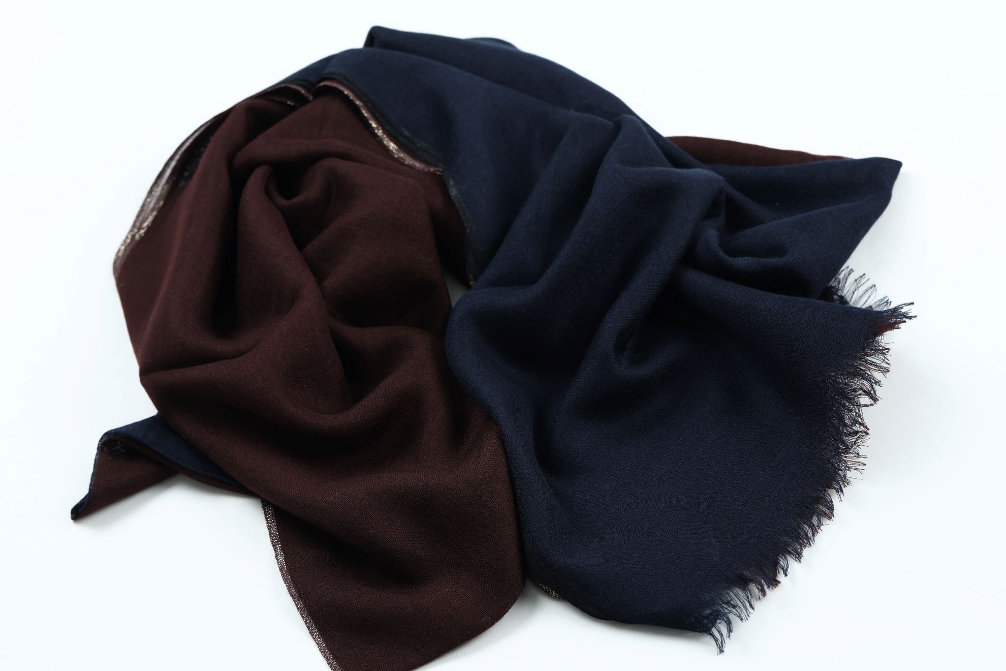 Kašmírová šála s bordurou zlaté barvy rozdělující šálu na část tmavě vínovou a královsky modrou. Utkaná z těch nejjemnějších kašmírových vláken, která je symbolem udržitelného luxusu a komfortu.
