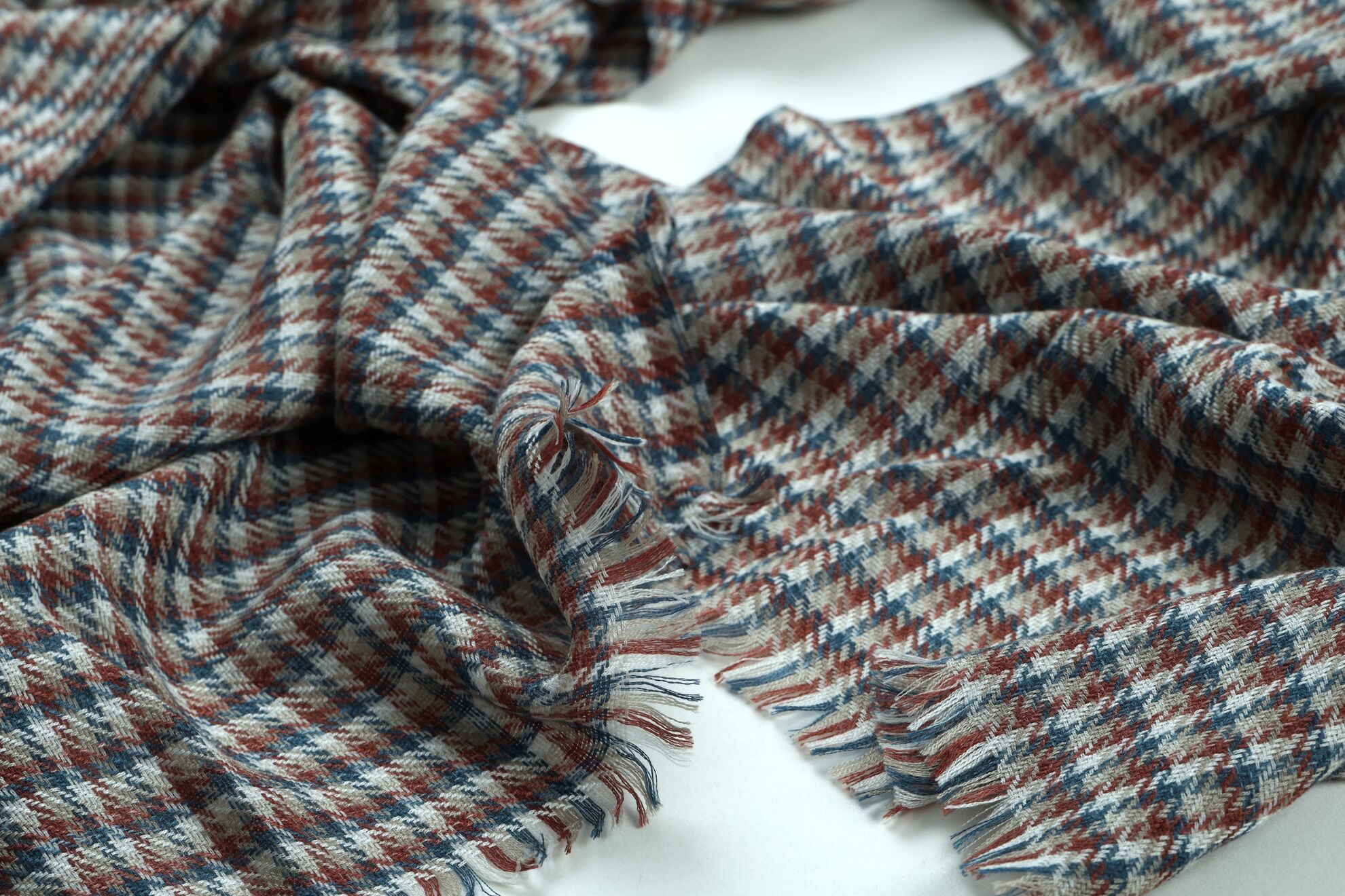 Kašmírová šála se vzorem kohoutí stopy v barvách vínové, modré, béžové a bílé. Utkaná z těch nejjemnějších kašmírových vláken, která je symbolem udržitelného luxusu a komfortu.
