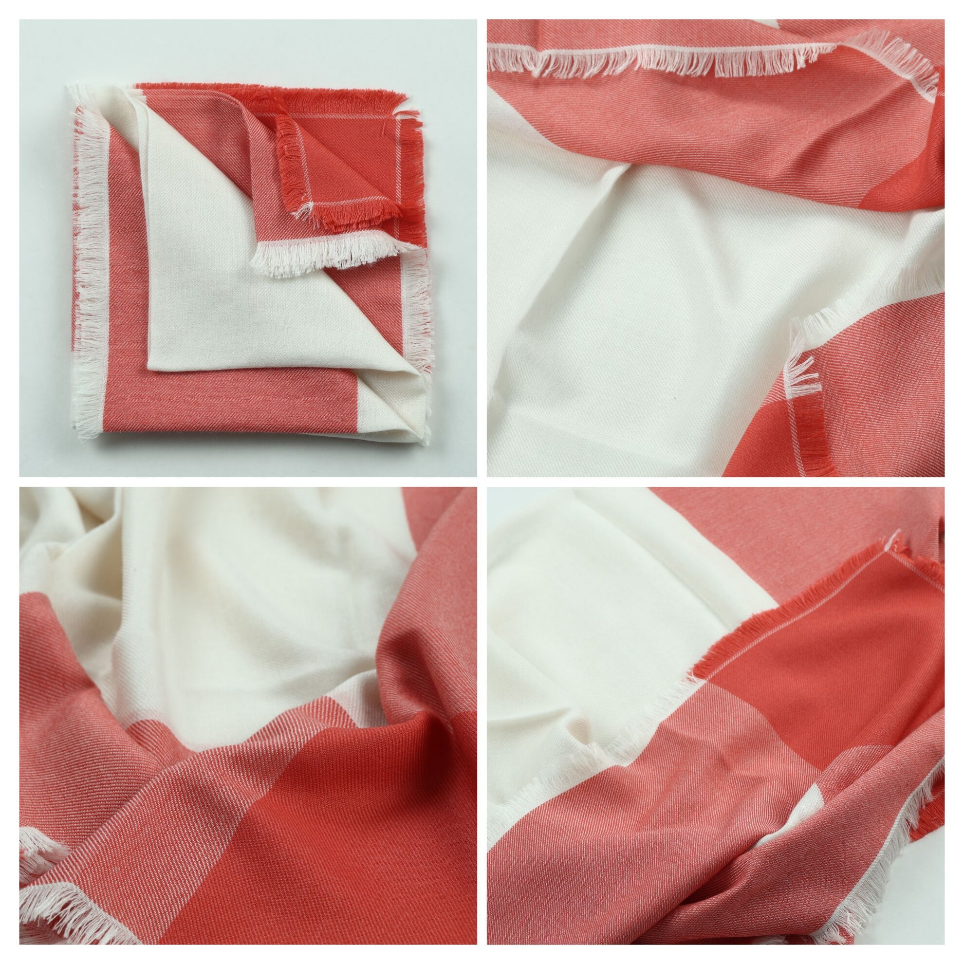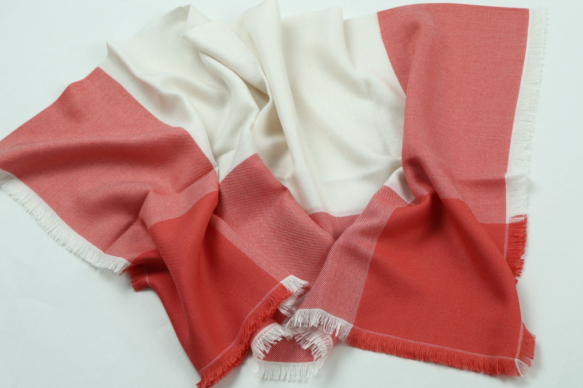 Kašmírová šála bílé a korálově červenooranžové barvy. Utkaná z těch nejjemnějších kašmírových vláken, která je symbolem udržitelného luxusu a komfortu.