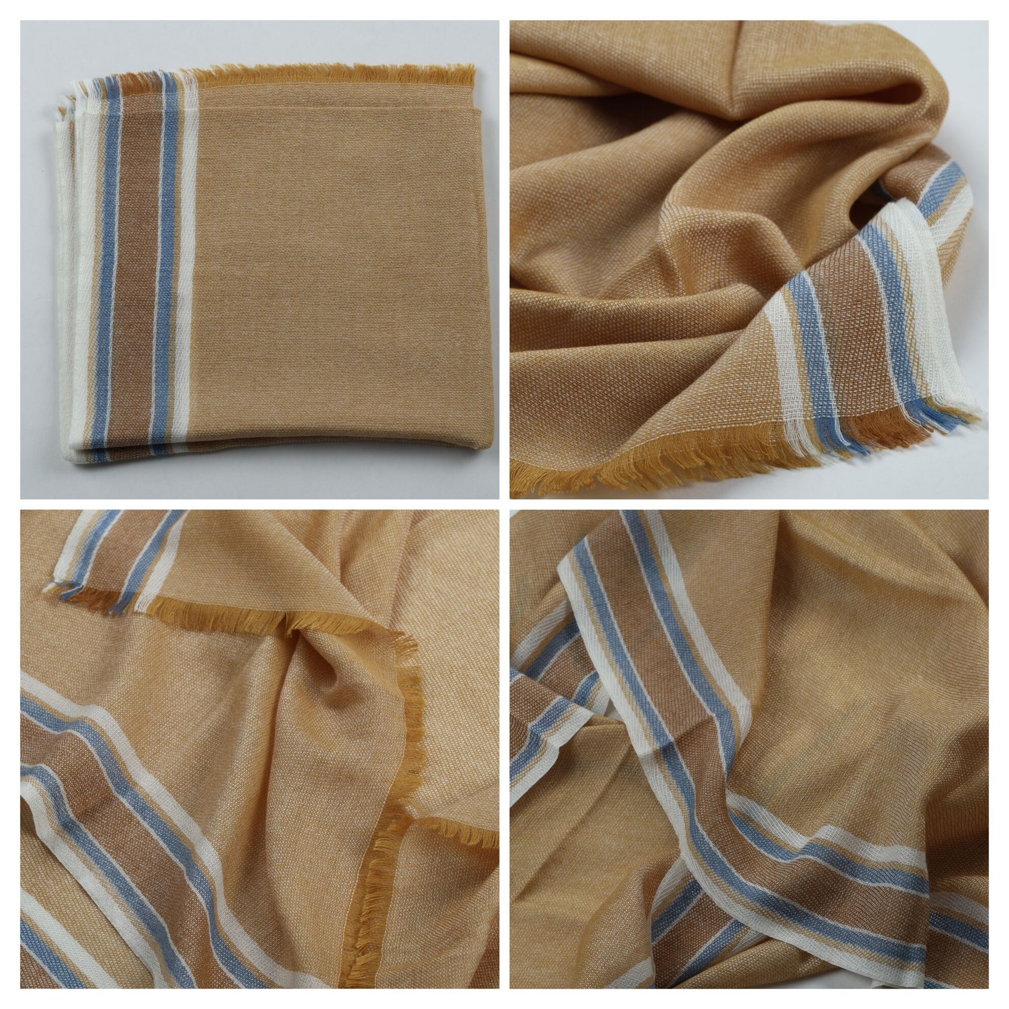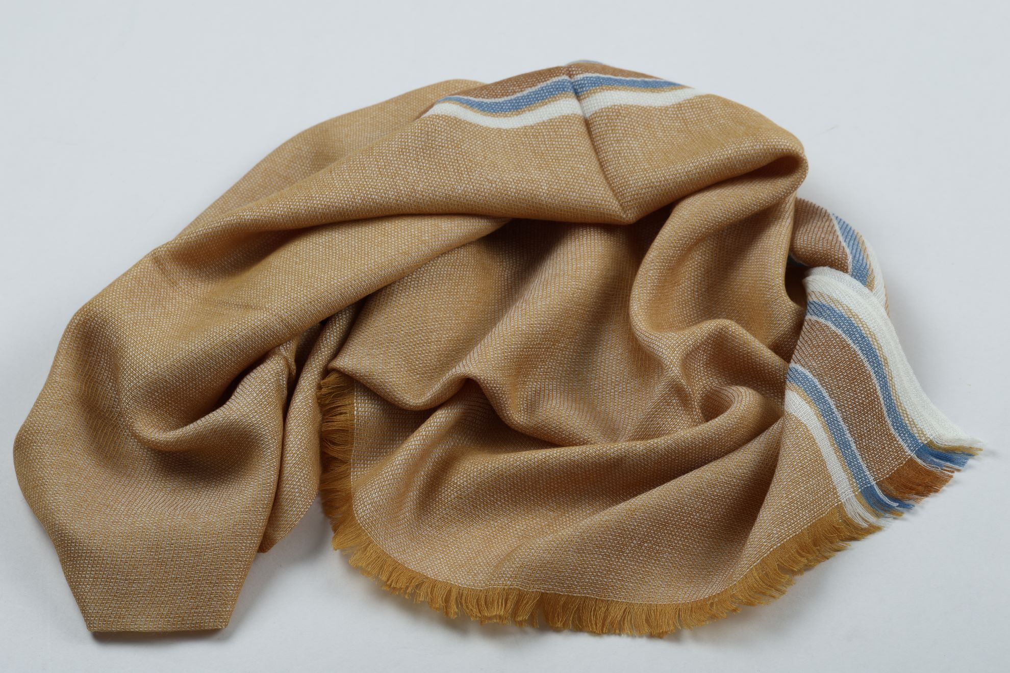 Kašmírová šála žluté barvy s modrými pruhy. Utkaná z těch nejjemnějších kašmírových vláken, která je symbolem udržitelného luxusu a komfortu.