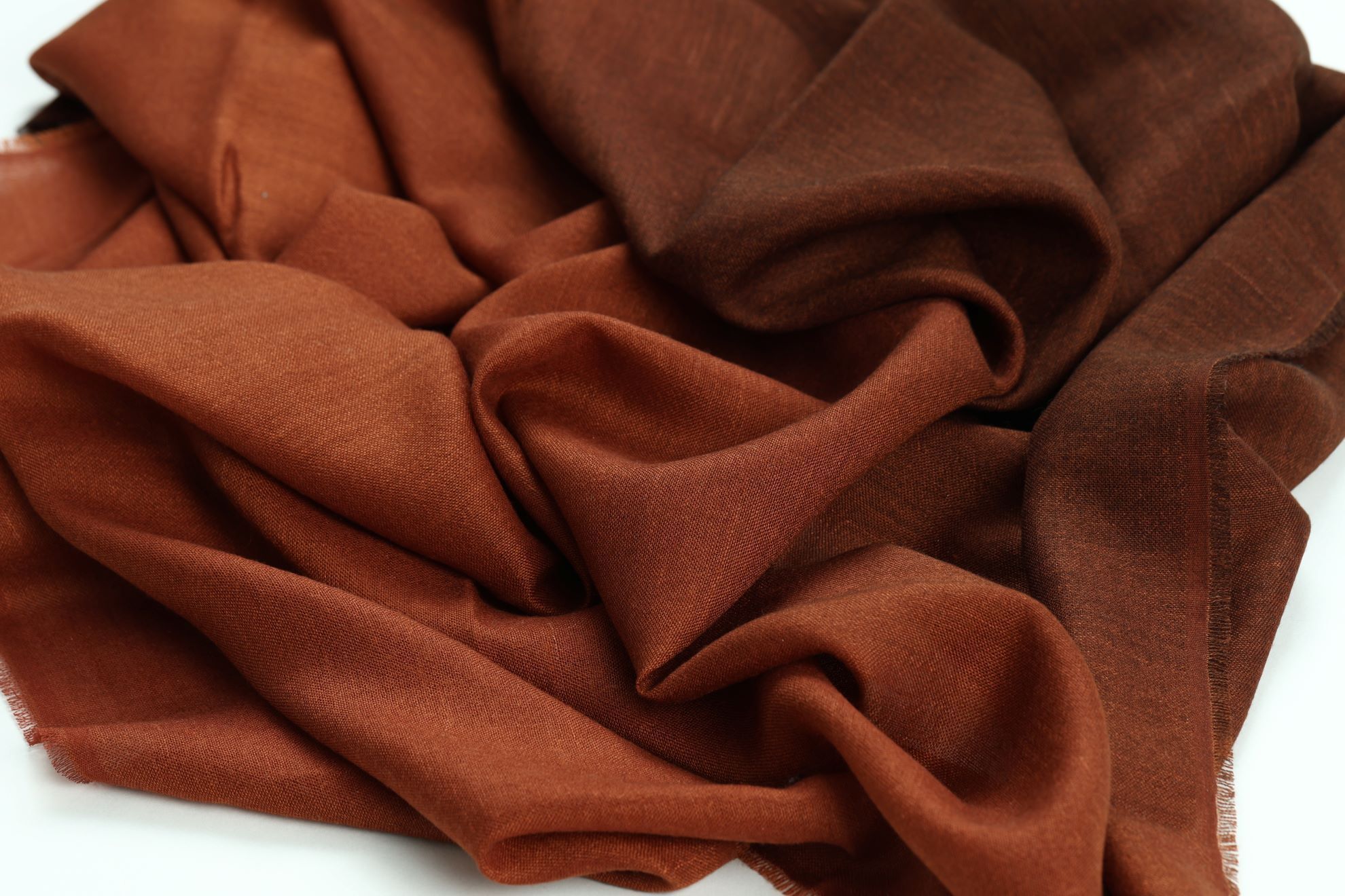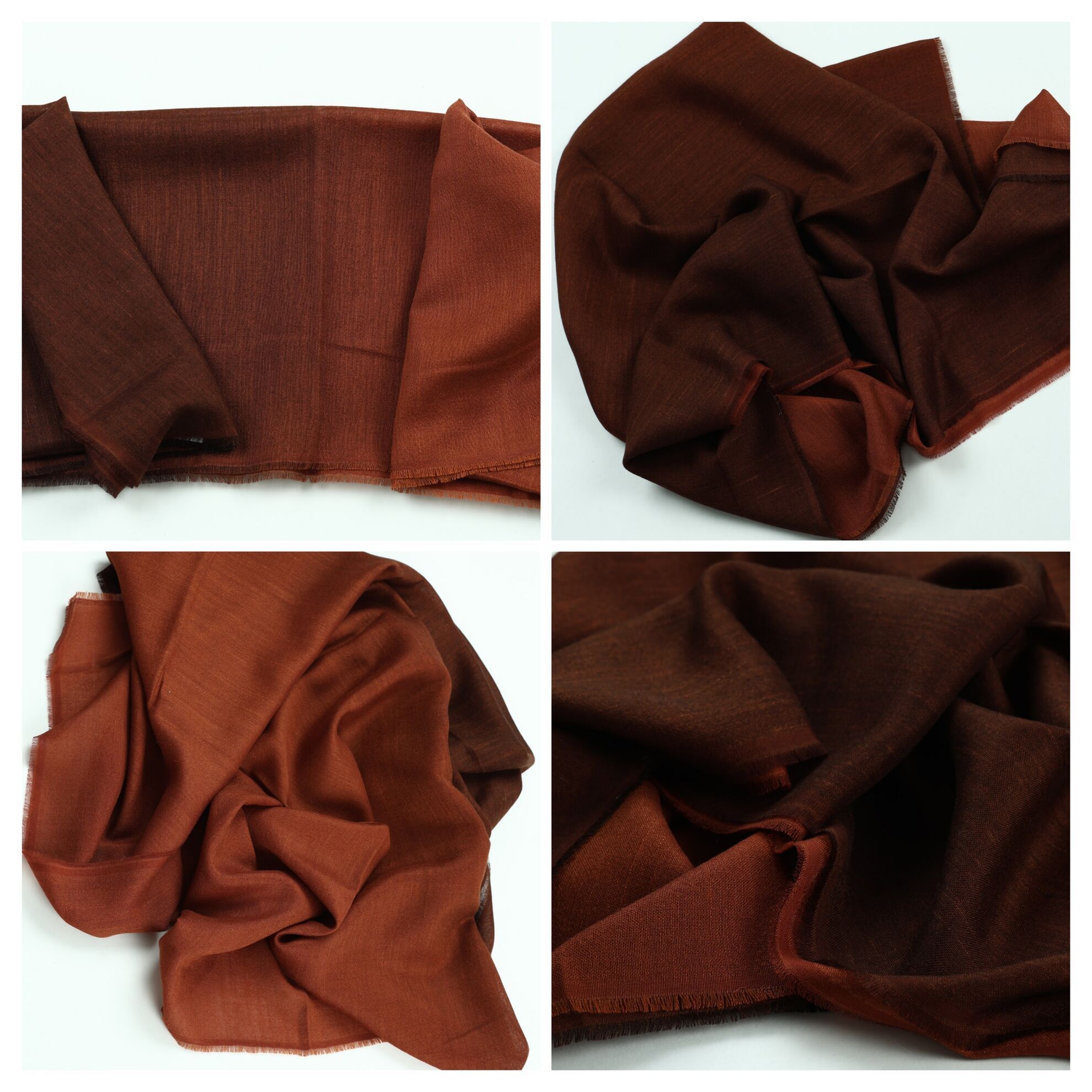 Kašmírová šála s hedvábím s efektem degradante, který se vyznačuje plynulým barevným přechodem od tmavých cihlově oranžových tónů po světlé. Šála má na dotek jemný zrnitý povrch, který jí dodává neotřelou texturu a hloubku. Vysoká kvalita se známkou luxusu vhodná pro každodenní nošení.