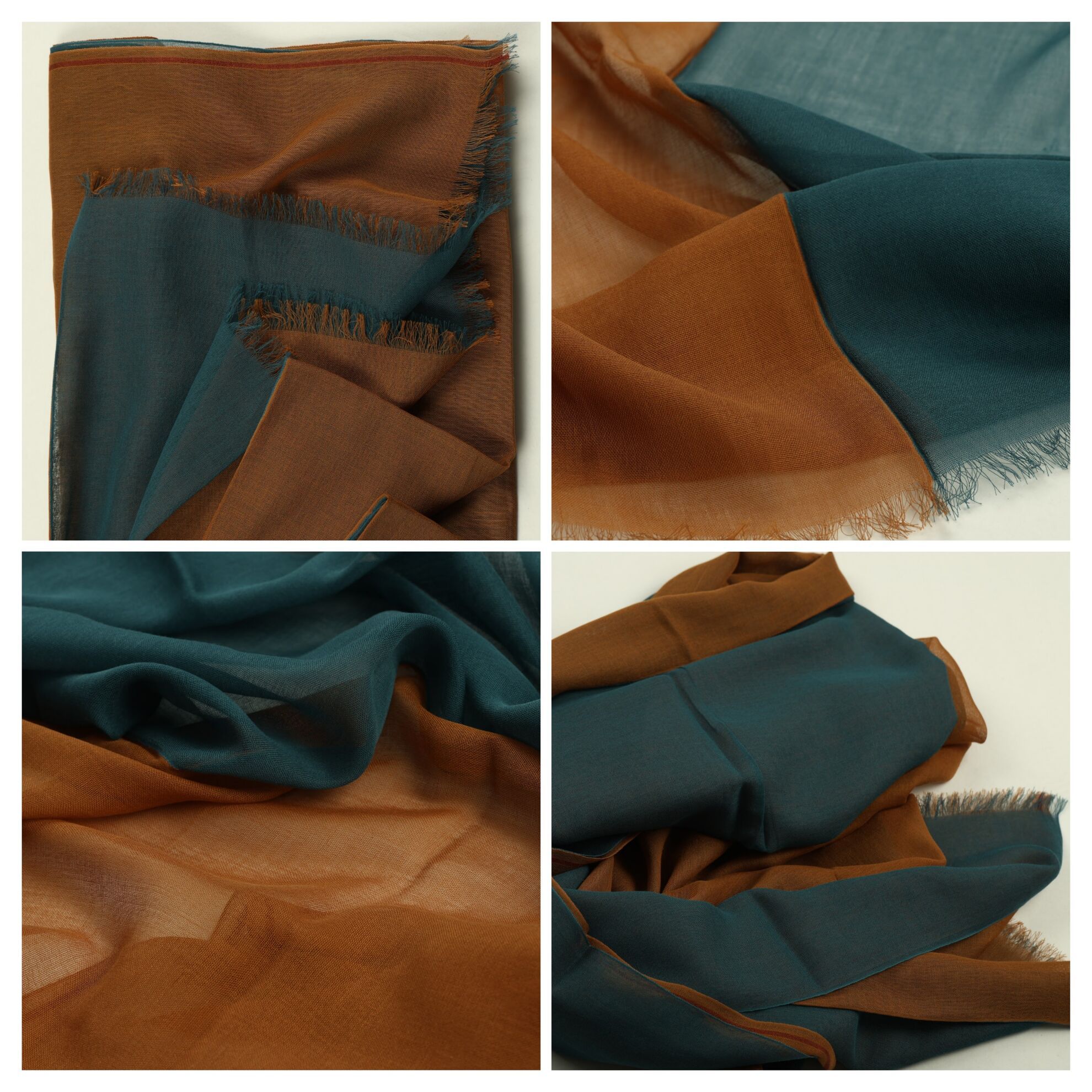 Získejte dva styly v jednom: Tato oboustranná šála je luxusně utkaná z hřejivého kašmíru s příměsí hedvábí, přičemž každá strana hraje jiným barevným tónem – rezavým a tyrkysovým.