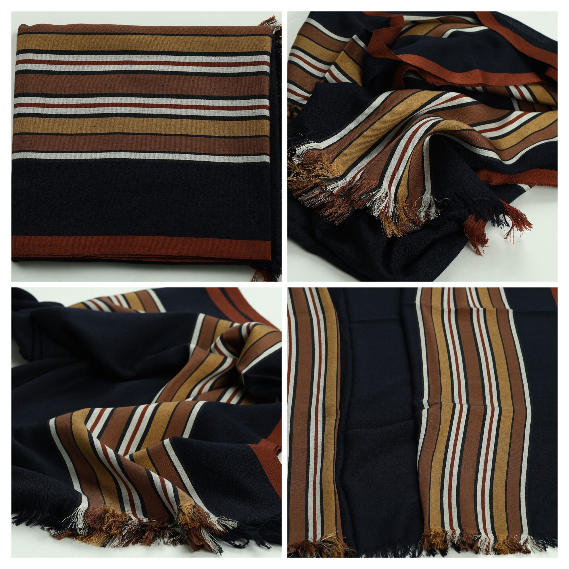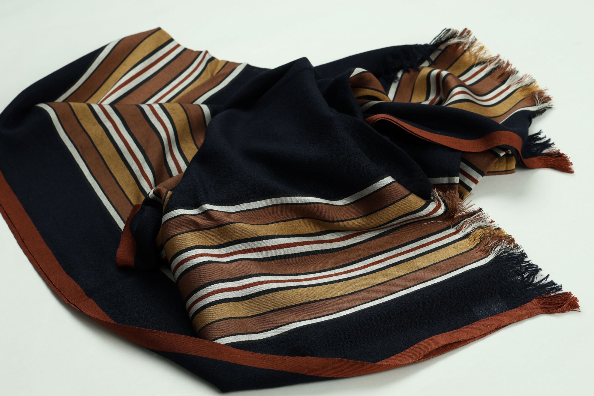 Kašmírová šála s hedvábím tmavěmodré barvy s pruhy zlatorezavých tónů. Utkaná z těch nejjemnějších kašmírových vláken, která je symbolem udržitelného luxusu a komfortu.