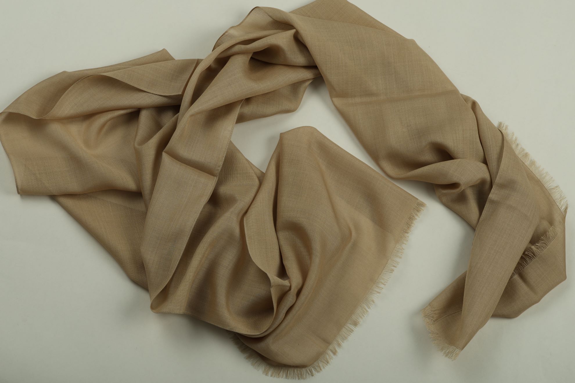 Kašmírová šála s hedvábím béžové barvy. Utkaná z těch nejjemnějších kašmírových vláken, která je symbolem udržitelného luxusu a komfortu.