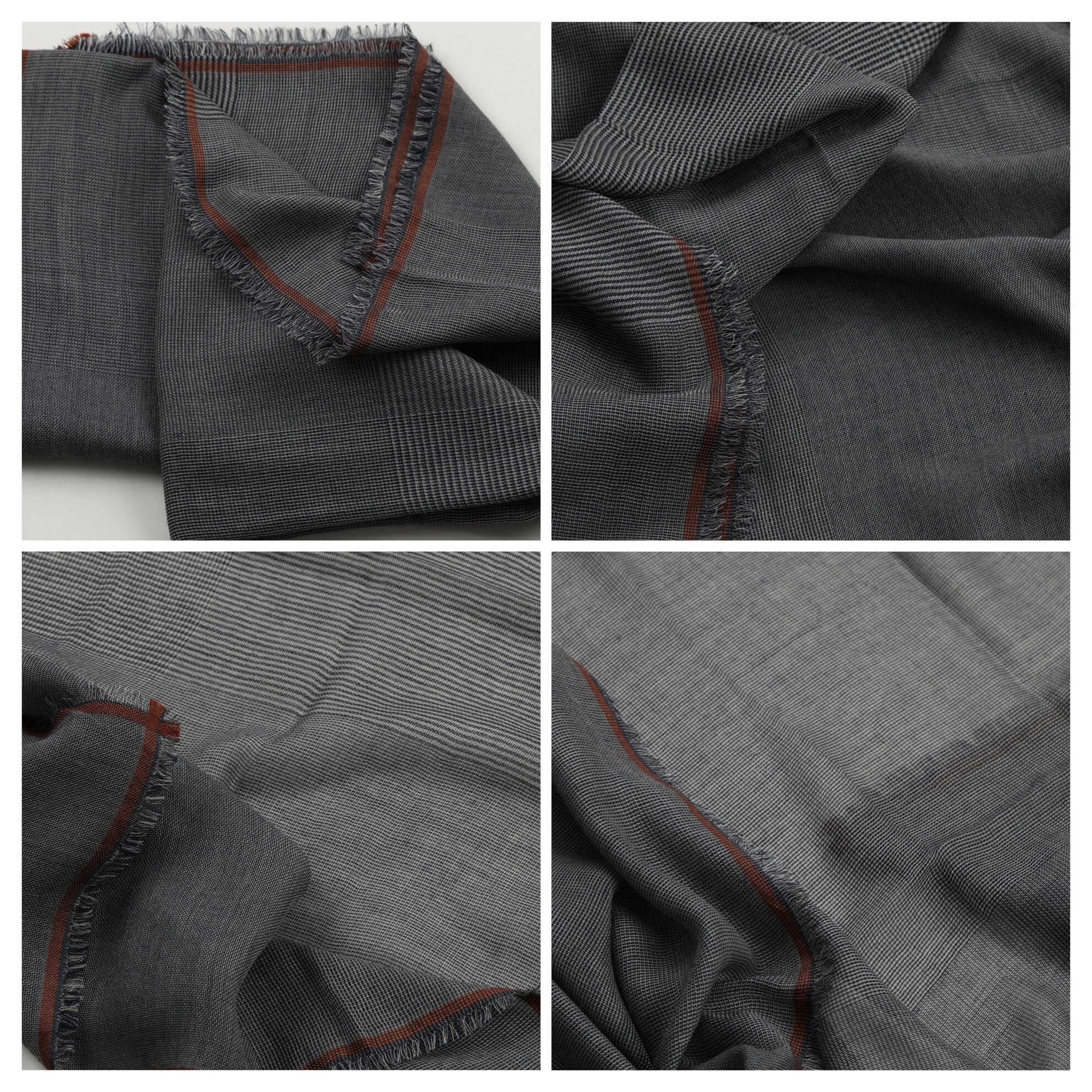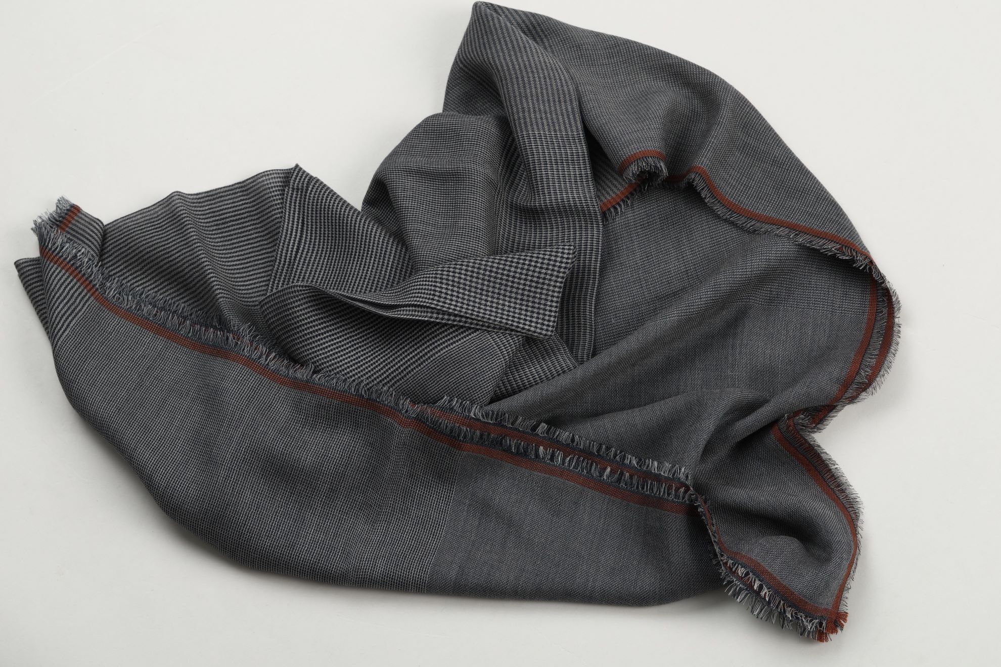 Kašmírová šála s hedvábím, žakárovou vytkávkou ve vzoru šedých kostek s rezavým pruhem. Utkaná z těch nejjemnějších kašmírových vláken, která je symbolem udržitelného luxusu a komfortu.