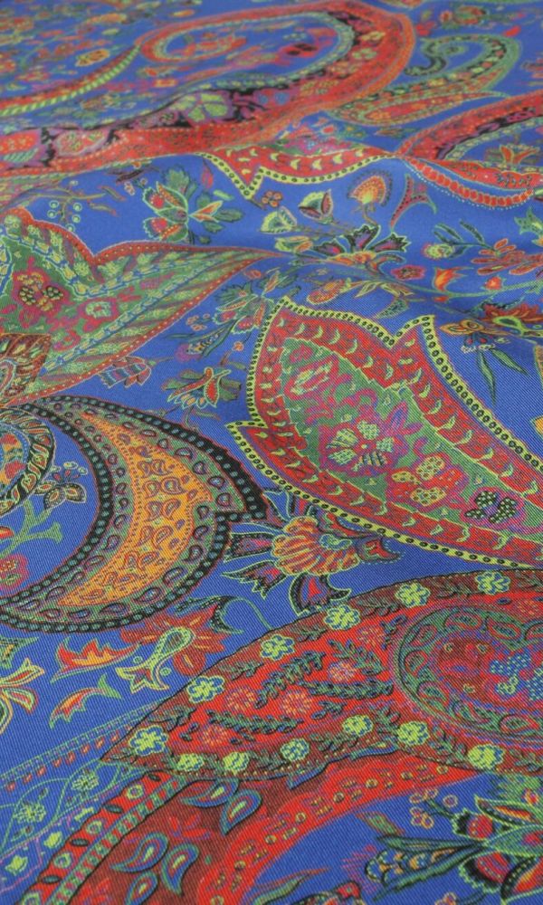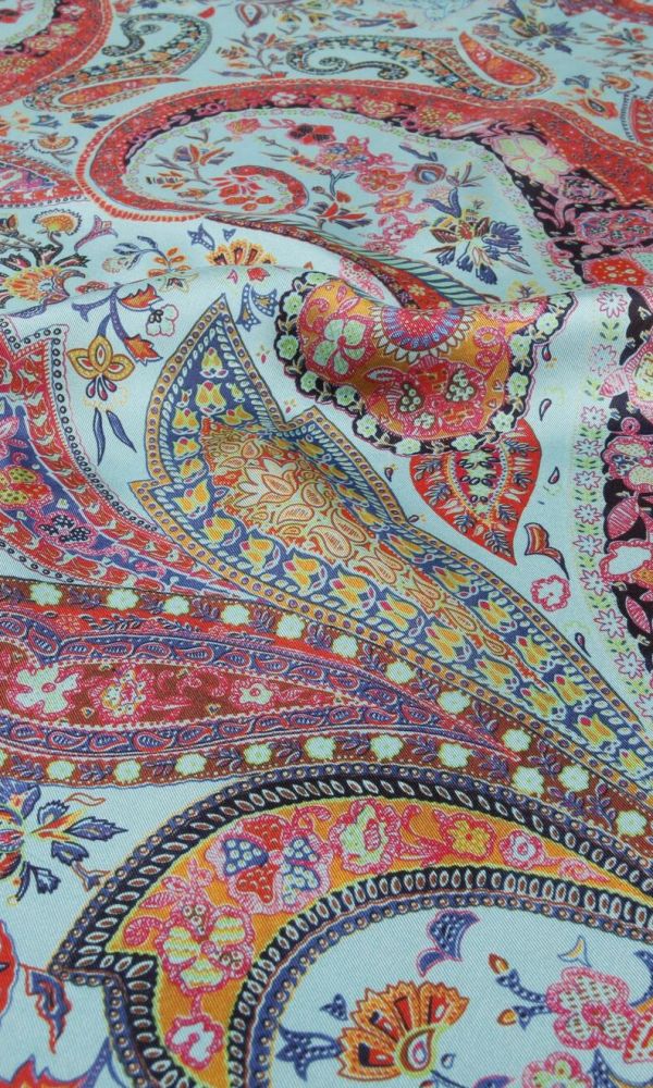 Hedvábný tvil se světle smaragdovým kašmírovým vzorem je hebká pevná tkanina vhodná na košile, halenky, šaty a sukně.
