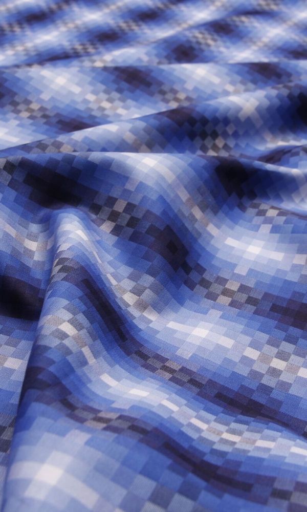 Košilovka utkaná z těch nejjemnějších vláken. Na bílé ploše uvnitř okenního modročerného kára jsou jemně vytkané kostky viditelné v pohybu. Doporučujeme na luxusní košile a halenky, letní šaty.