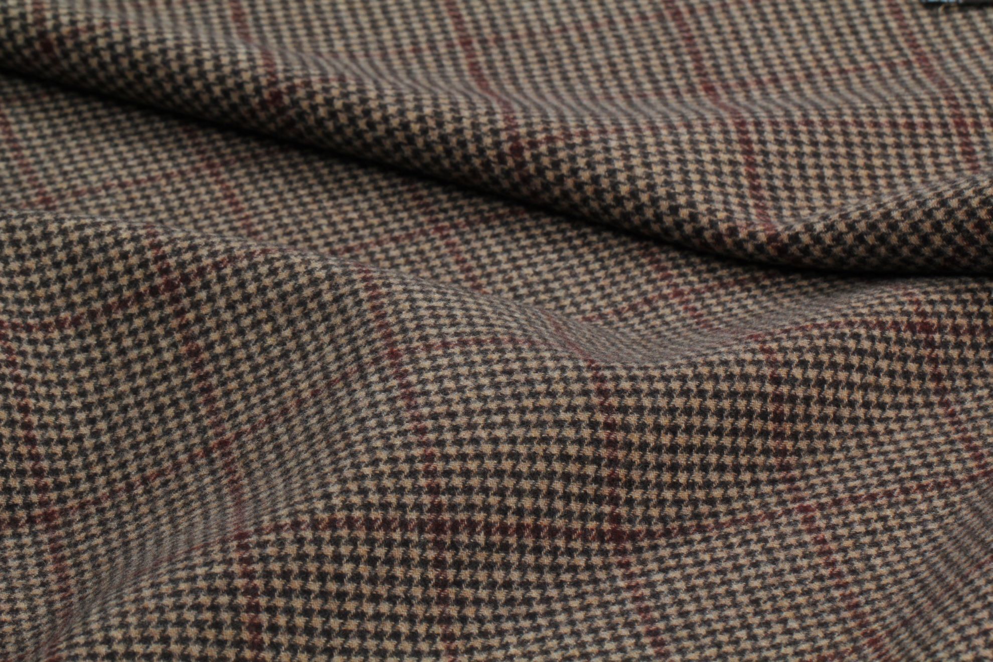 Oboustranná vlněná kabátovka je z měkkého hřejivého materiálu, který je otevíratelný a je možné ho využít z obou stran nebo kombinovat. Jedna strana je v hnědé čokoládové barvě , druhá strana je okenní káro v červené lince v béžových tónech kohoutí stopy. Doporučujeme na kabáty, peacoat, kabátky, kabany a kabátové vesty.